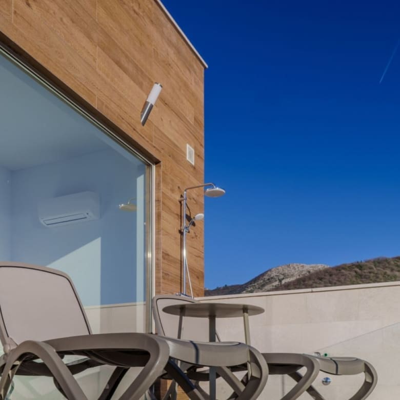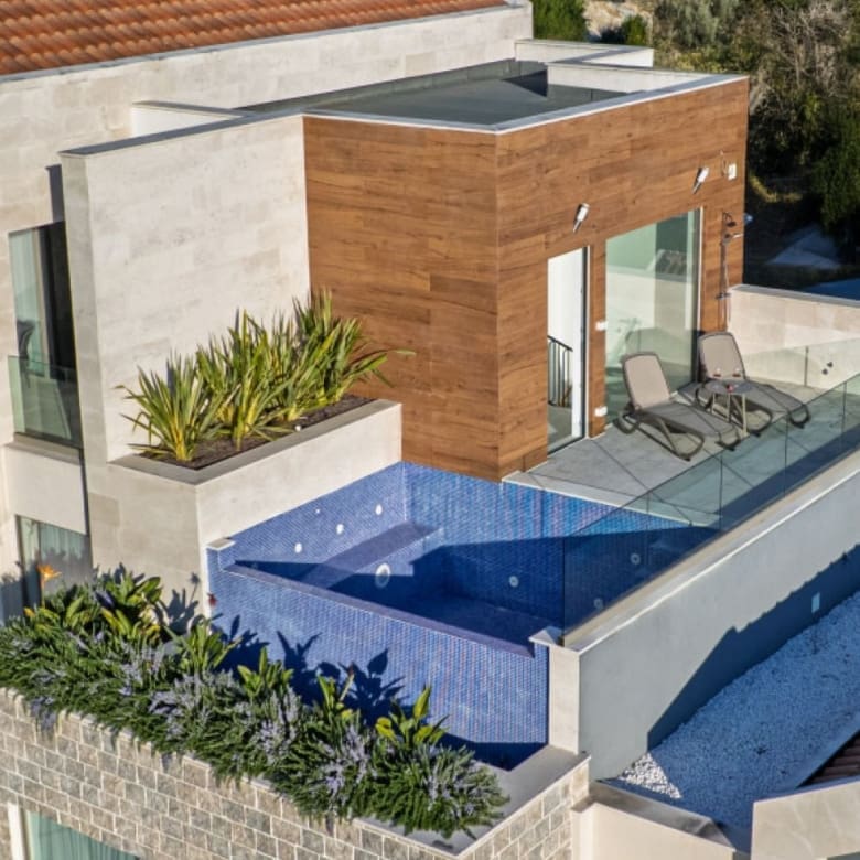 Jedes Lastva Park Townhouse verfügt über einen privaten 6-10 Meter Infinity-Edge-Pool mit Salzwasser-Chlorungssystem, Unterwasser-LED-Beleuchtung und optionaler Heizfunktion. Die Pools befinden sich auf Hauptterrassen oder Dachterrassen, mit Glaspanel-Sicherheitszäunen und Holzdecking aus Verbundwerkstoff.