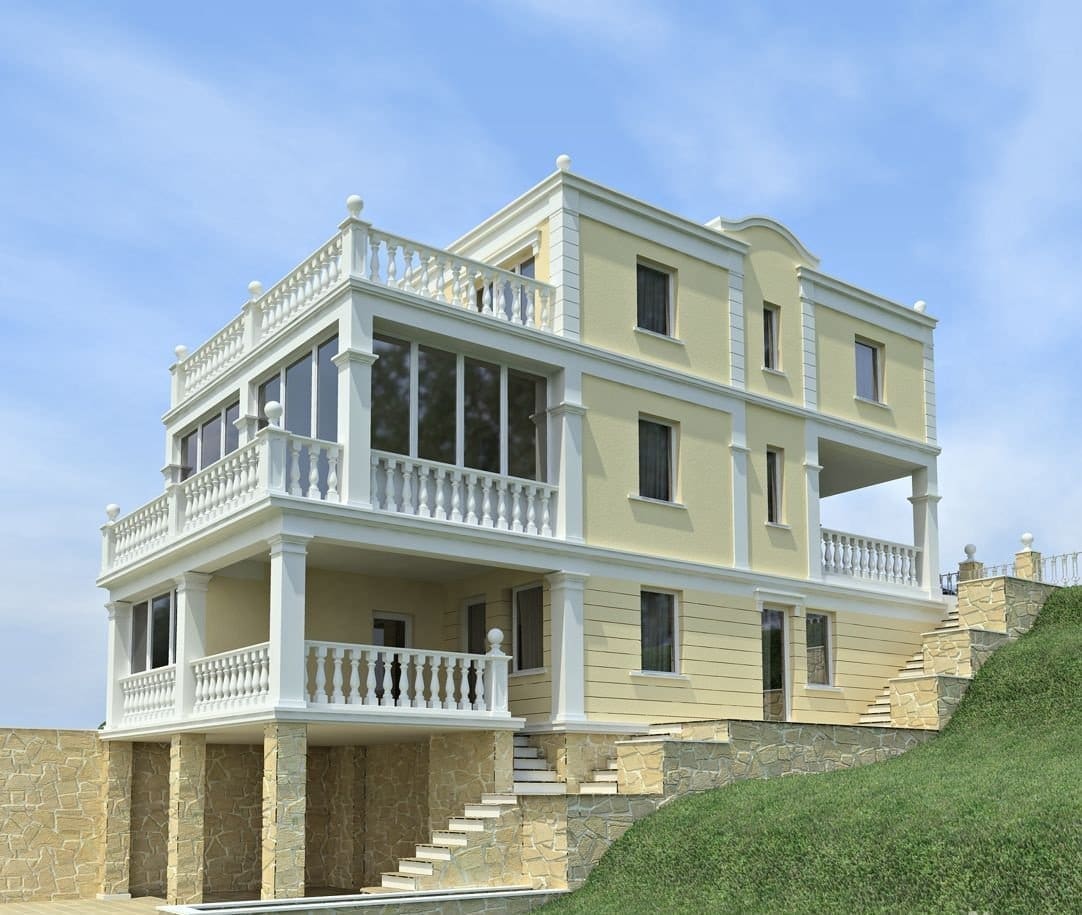 Die Villa ist ein Komplex aus 6 Apartments mit 8 Schlafzimmern, verteilt auf 3 Wohnebenen mit einer Gesamtfläche von 210 m² und Balkonen/Terrassen mit einer Fläche von 55 m².