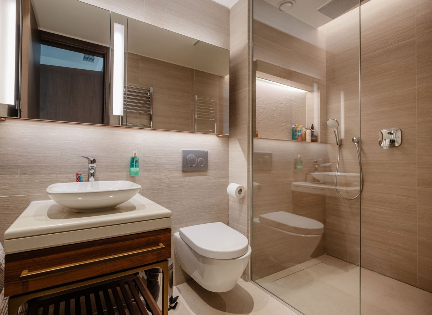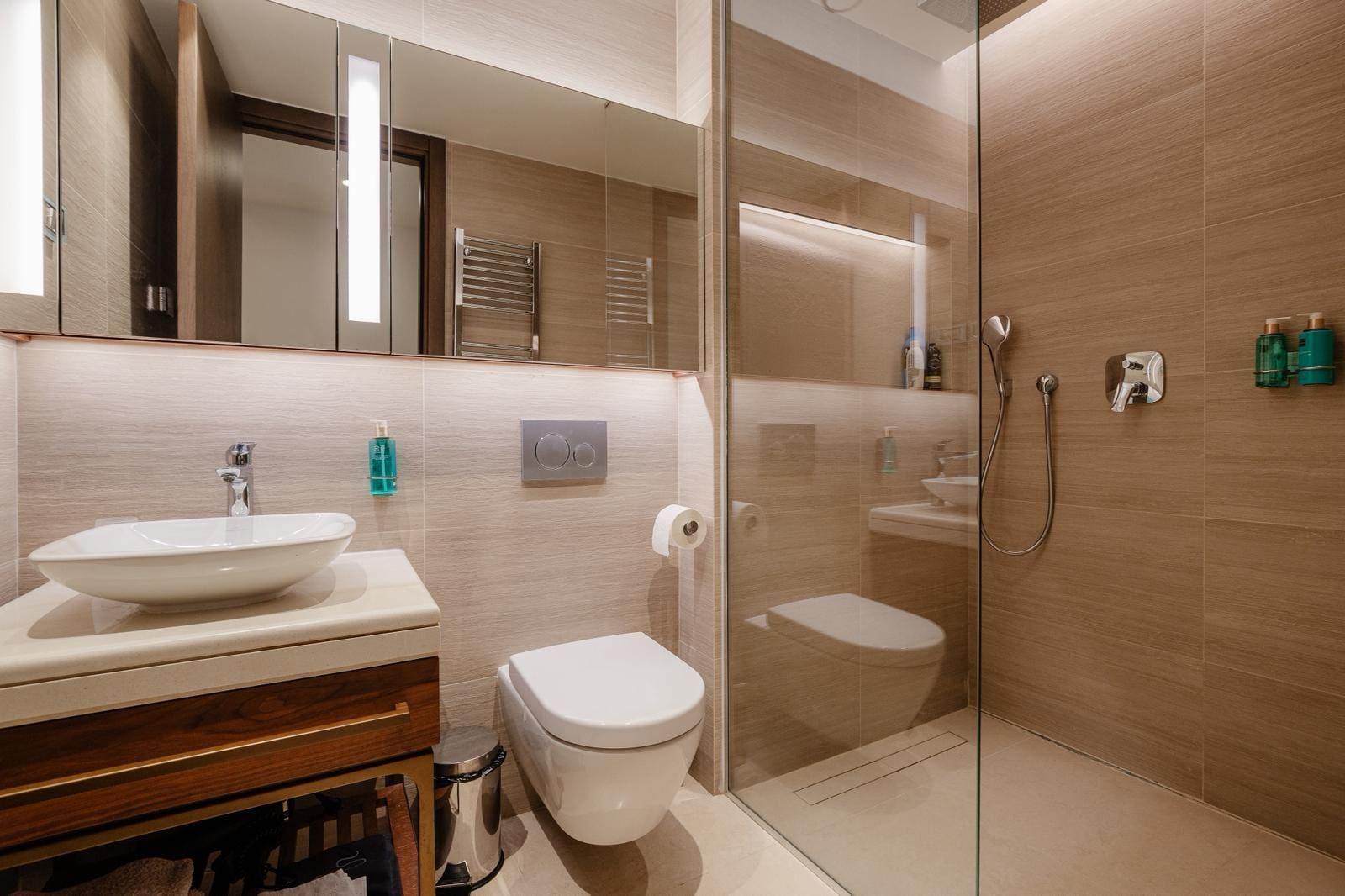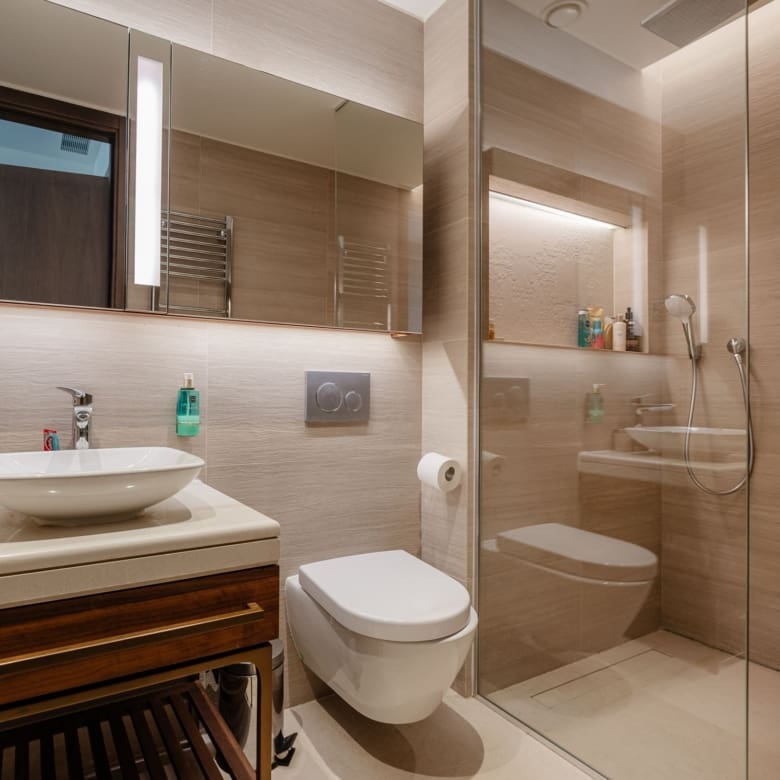 Does the apartment have two separate bathrooms? Yes. The apartment has two bathrooms serving two bedrooms, providing complete privacy for two couples, a family with children, or guests during short-term rental stays.
