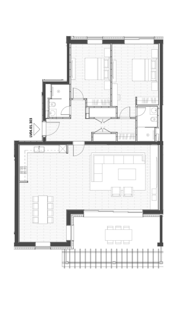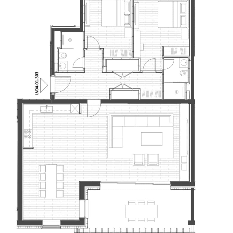 Strip away the terrace and the headline figure, and this apartment still delivers 142.2 m² of interior floor area — a living room with open kitchen and dining zone, two independently sized bedrooms each served by a private bathroom, and a hallway that separates the private sleeping areas from the social living space. This is the spatial logic of a well-designed family home transposed into a resort setting.