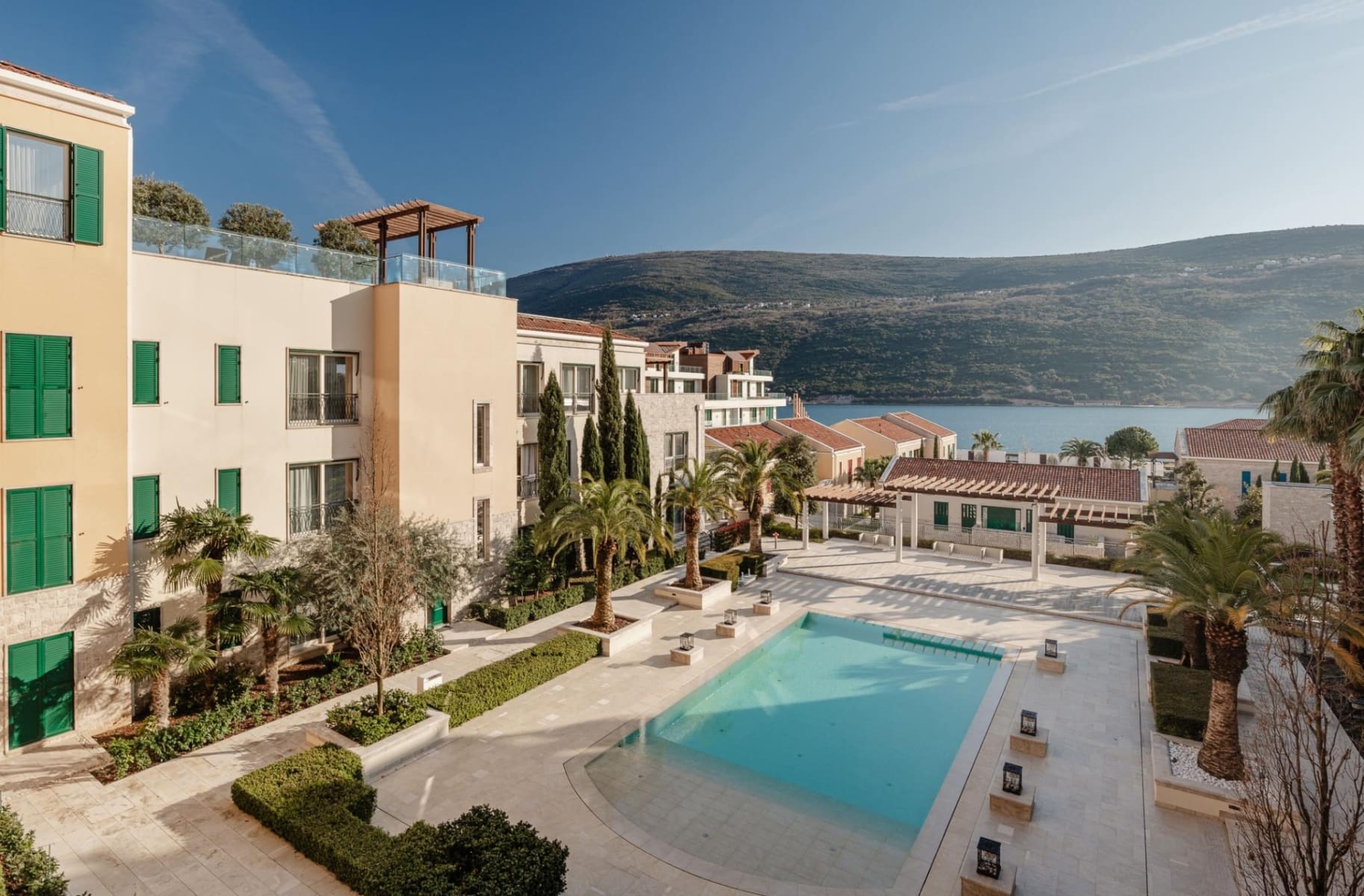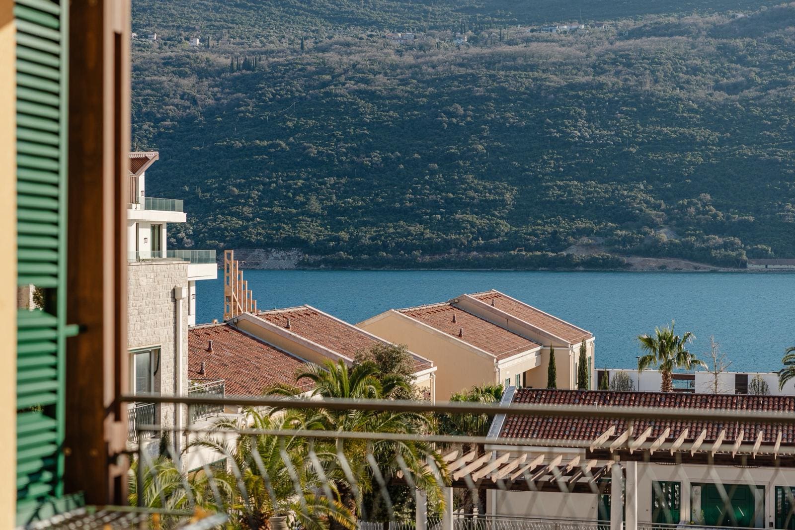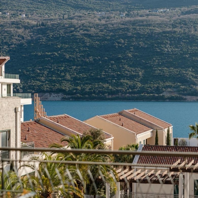 The Bay of Kotor (Boka Kotorska) is a naturally enclosed sea inlet — the only fjord in Southern Europe — and its western entrance at Kumbor is precisely where Portonovi sits. From the 3rd floor, the 29.4 m² terrace looks directly across that entrance: open water to the left, the Venetian-era fortifications on the Prevlaka peninsula ahead, the Orjen mountain ridge rising steeply behind the bay to the right. This is a view that frames centuries of maritime history. No rendered visualisation of Portonovi is necessary — the real thing is better.