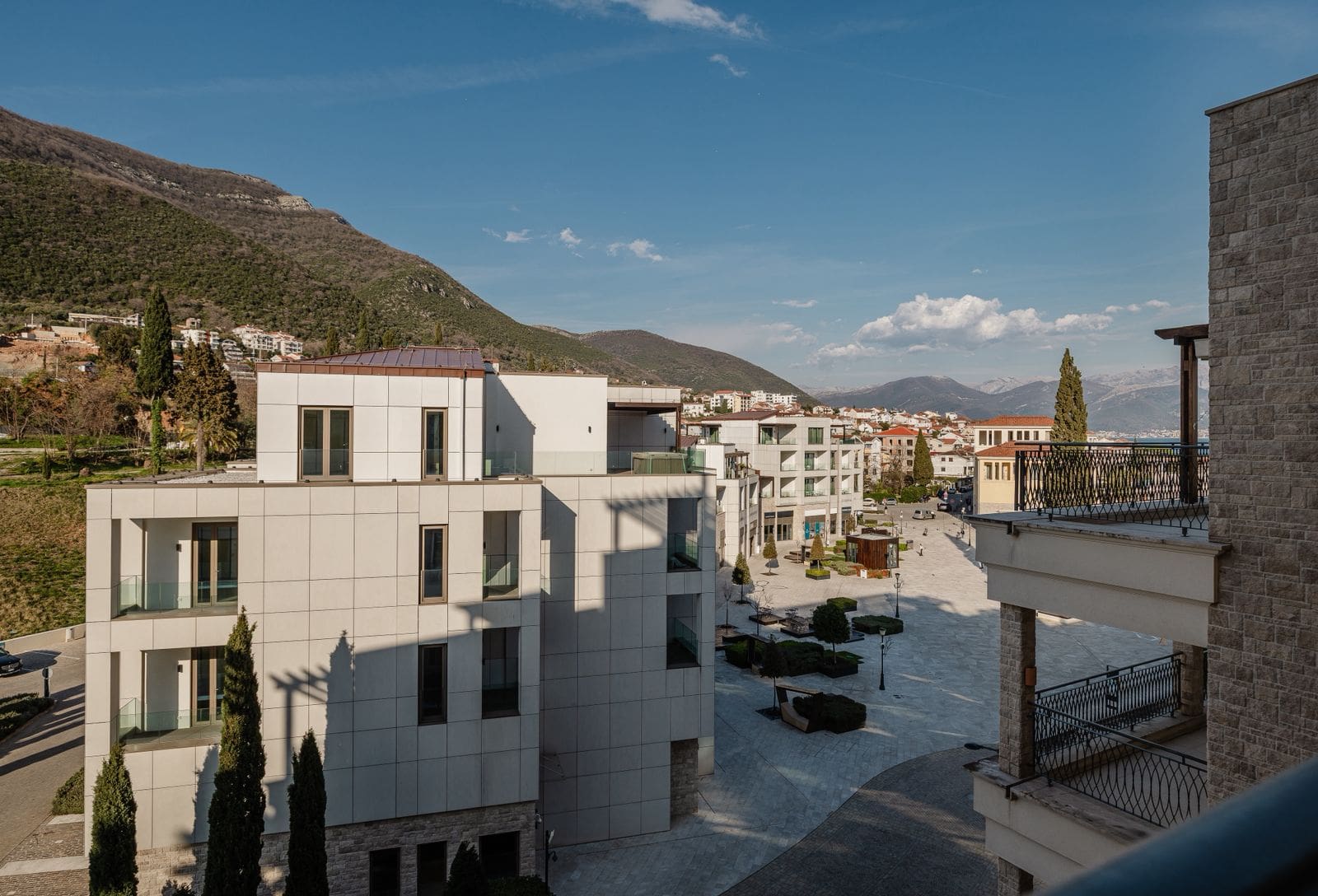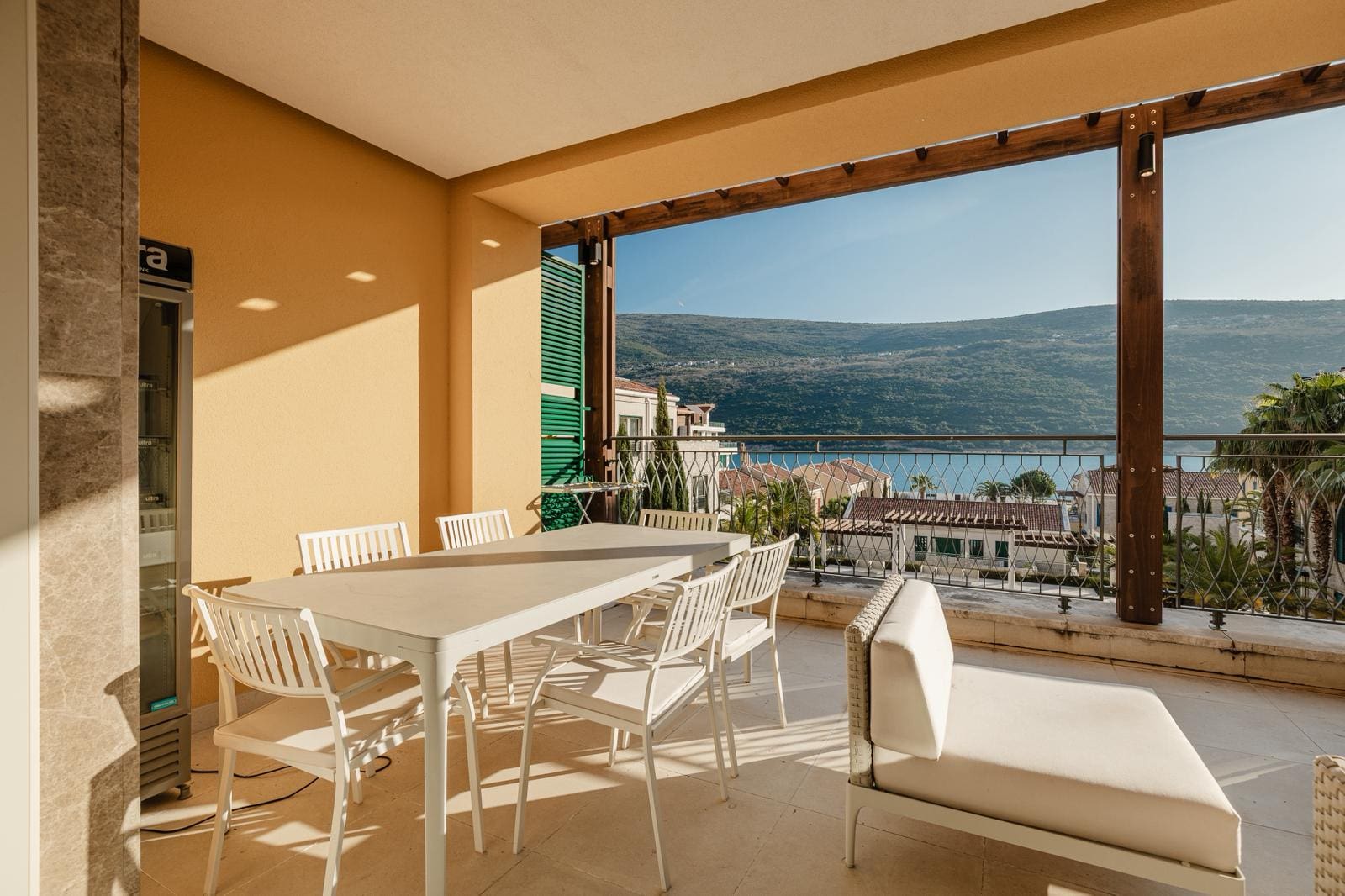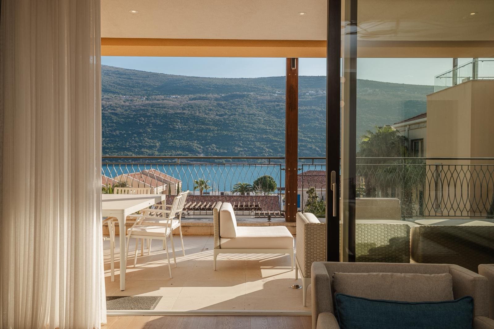 The Bay of Kotor (Boka Kotorska) is a naturally enclosed sea inlet — the only fjord in Southern Europe — and its western entrance at Kumbor is precisely where Portonovi sits. From the 3rd floor, the 29.4 m² terrace looks directly across that entrance: open water to the left, the Venetian-era fortifications on the Prevlaka peninsula ahead, the Orjen mountain ridge rising steeply behind the bay to the right. This is a view that frames centuries of maritime history. No rendered visualisation of Portonovi is necessary — the real thing is better.