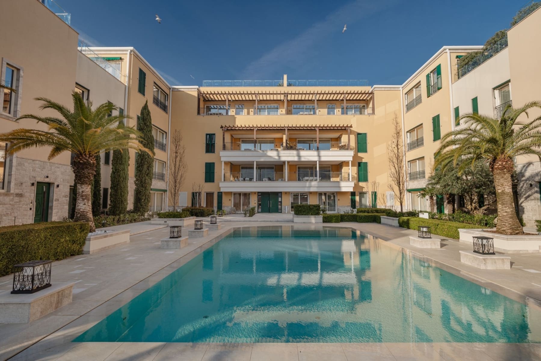 Hospitality: One&Only Portonovi hotel — fine dining, Sunset Roof Bar overlooking the bay entrance, and the full service standard of an internationally recognised five-star hotel brand available to residents on their doorstep.