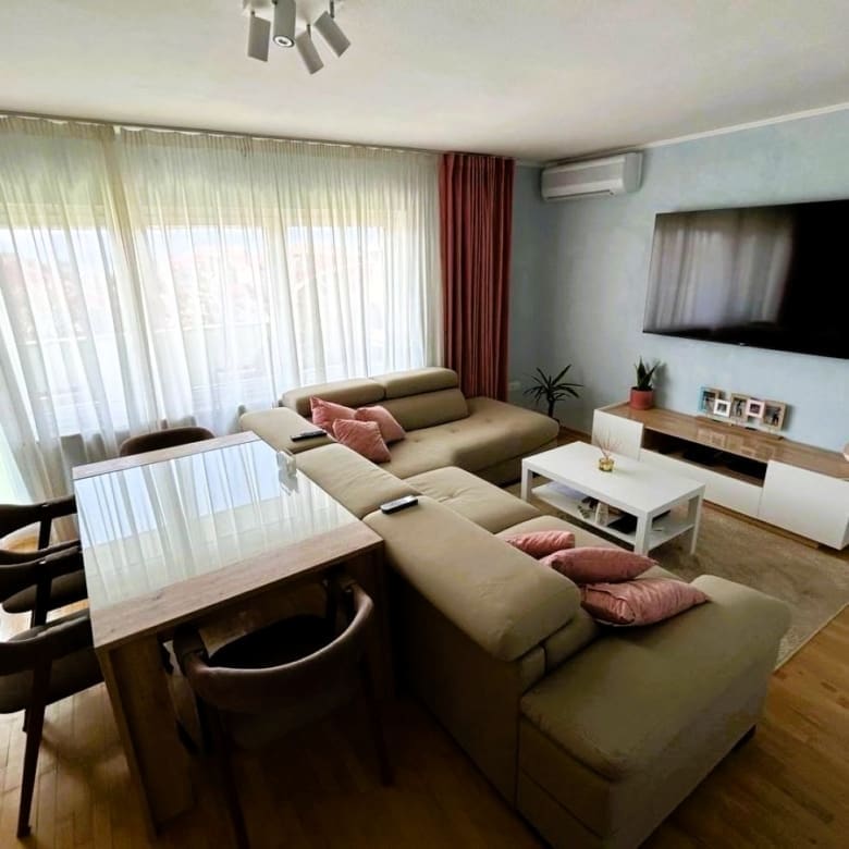 Откройте для себя эту светлую 2-комнатную квартиру на продажу в Тивате. Объединяя просторные 83м² интерьера с обширной 24м² террасой, эта полностью меблированная квартира расположена в спокойном жилом районе, и при этом всего в 10 минутах ходьбы от центра Тивата и марины Порто Монтенегро.