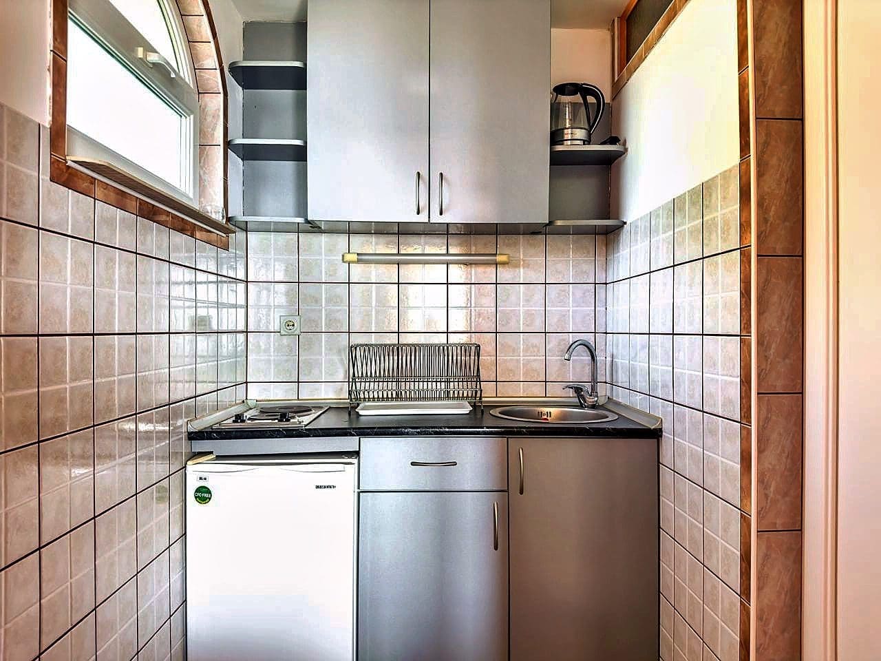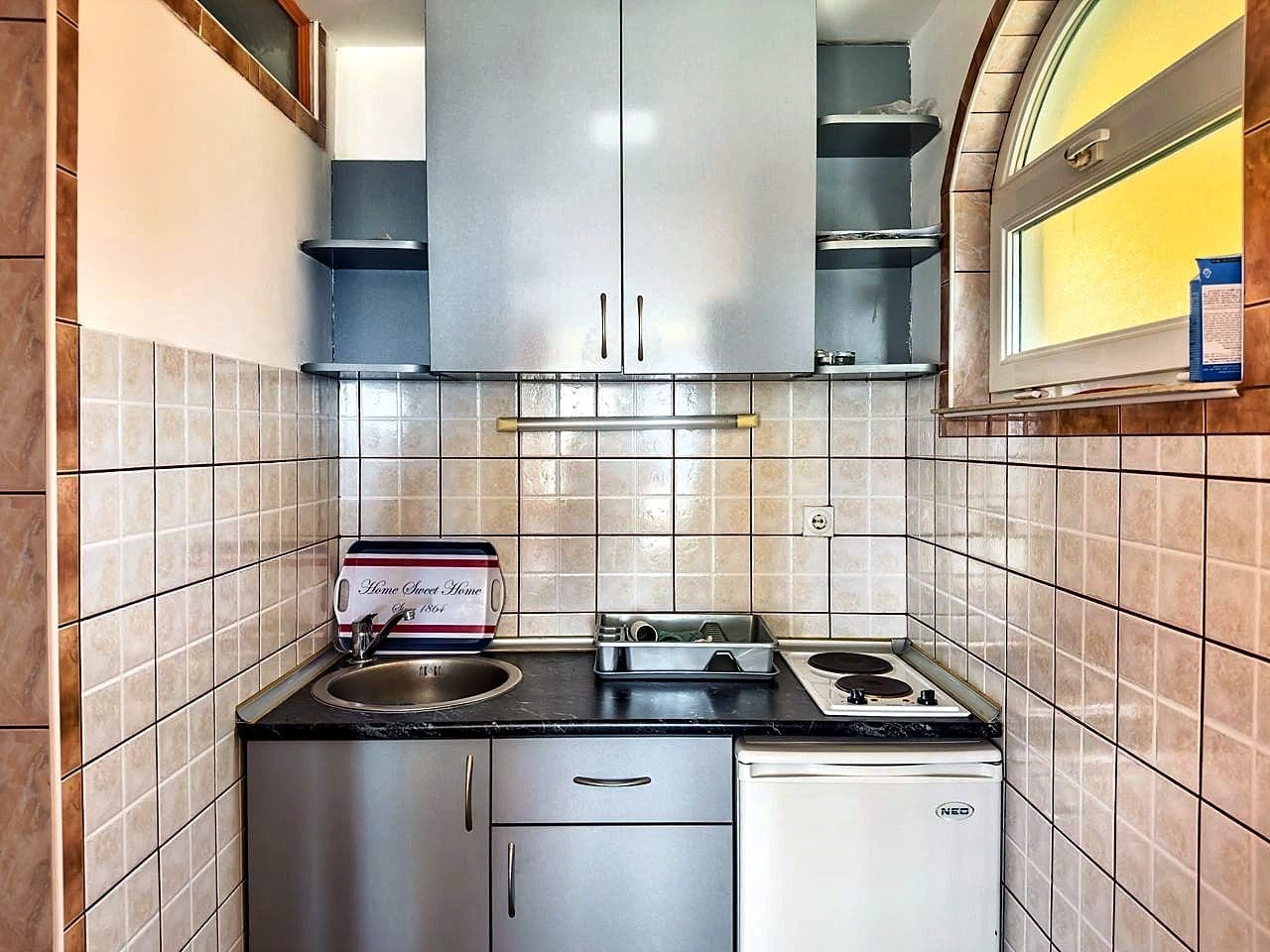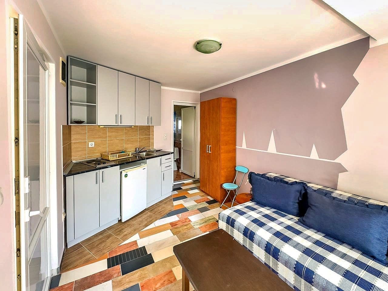 Mutfaklı iki kompakt stüdyo daire ve deniz manzaralı geniş bir teras.