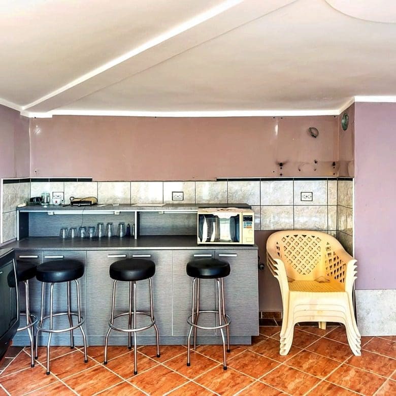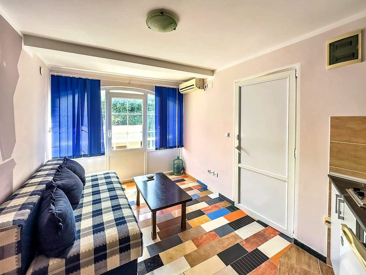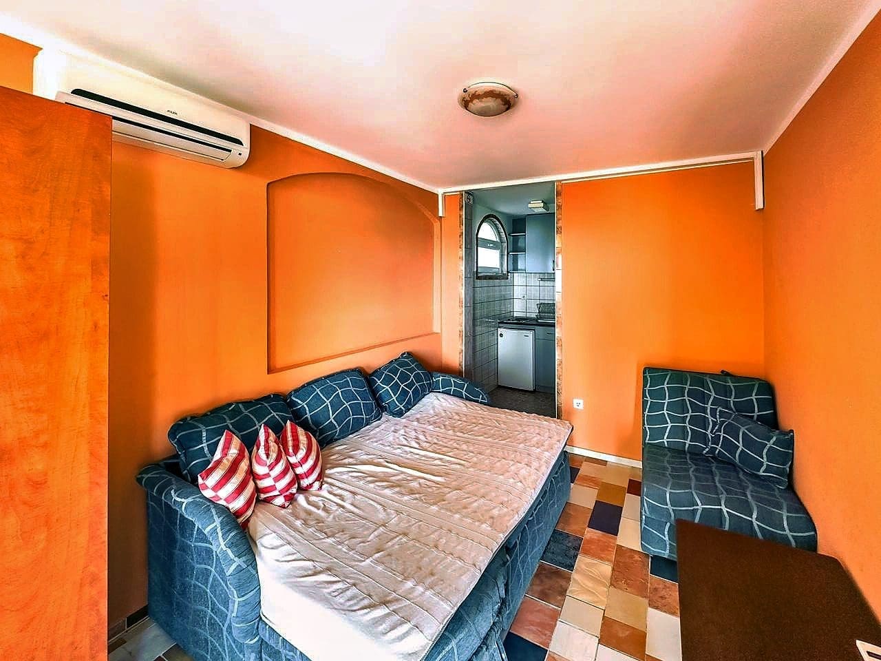Mutfaklı iki kompakt stüdyo daire ve deniz manzaralı geniş bir teras.