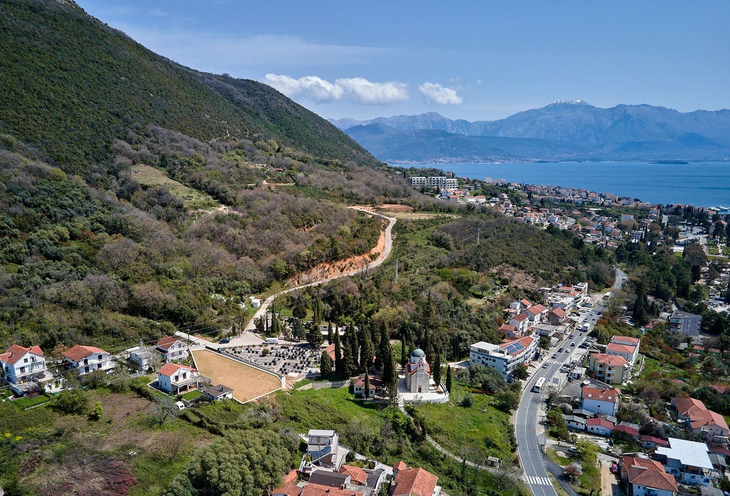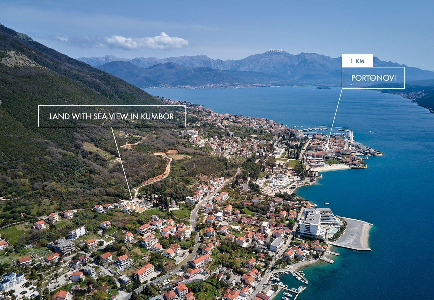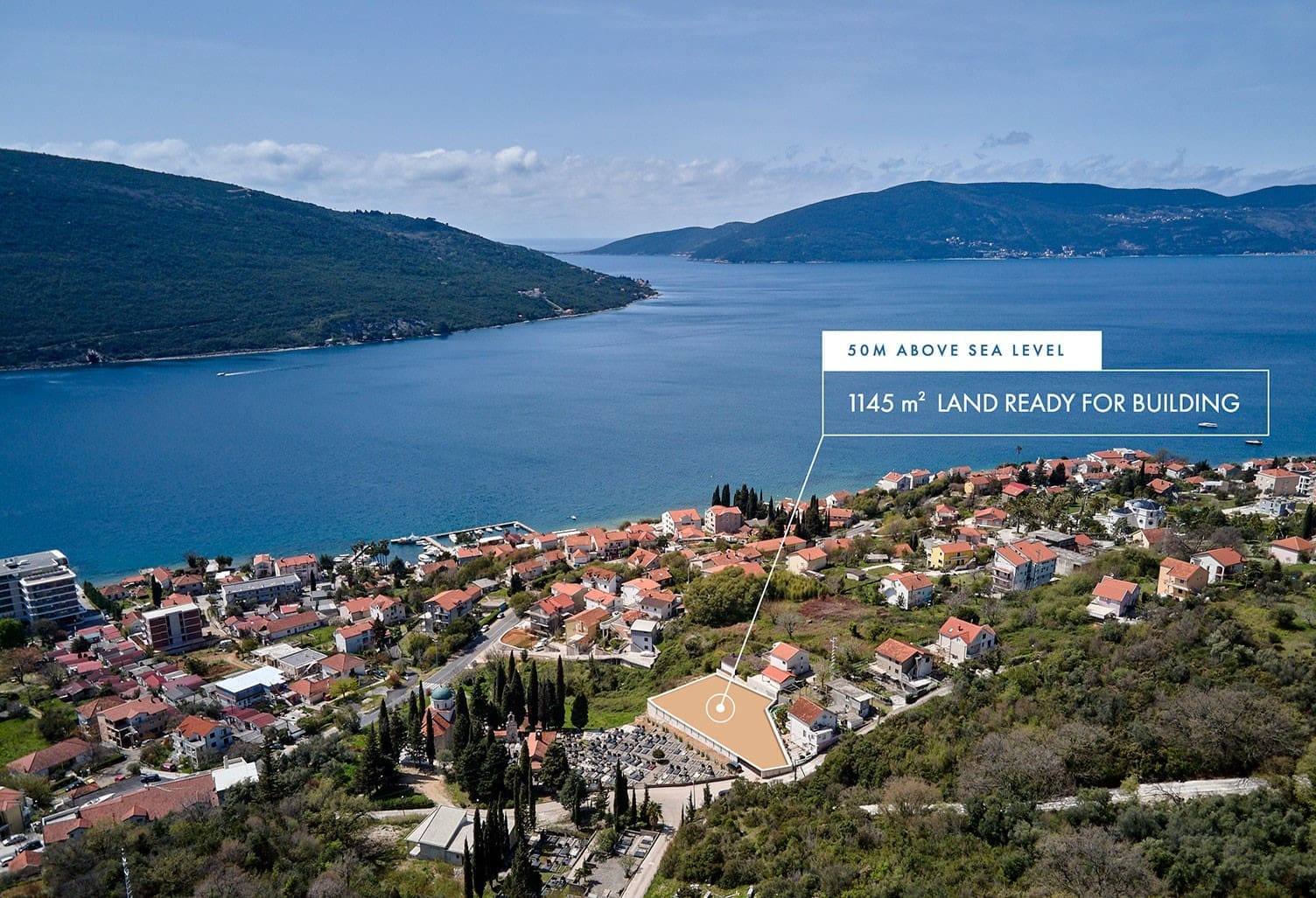Araziden muhteşem, panoramik deniz manzarası ve Boka Kotorska Körfezi görülmektedir.